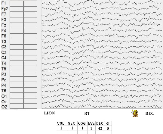 A decisão tomada (DEC) e o tempo (RT) necessário para essa decisão são resgistrados para cada evento EVE e cada voluntário VOL são armazenado na base de dados de performance (PDB). Outros dados importantes (como pe sexo) relevantes para cada protocolo de pesquisa, são registrados também na PDB.